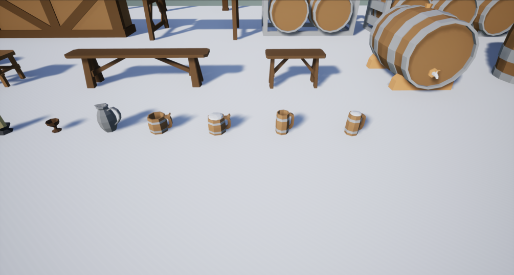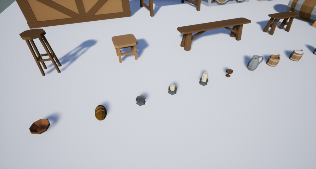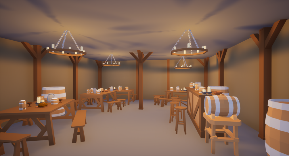 The pack contains 27 low poly props to furnish a tavern or inn including benches, kegs, candles, pints, tableware, poles.